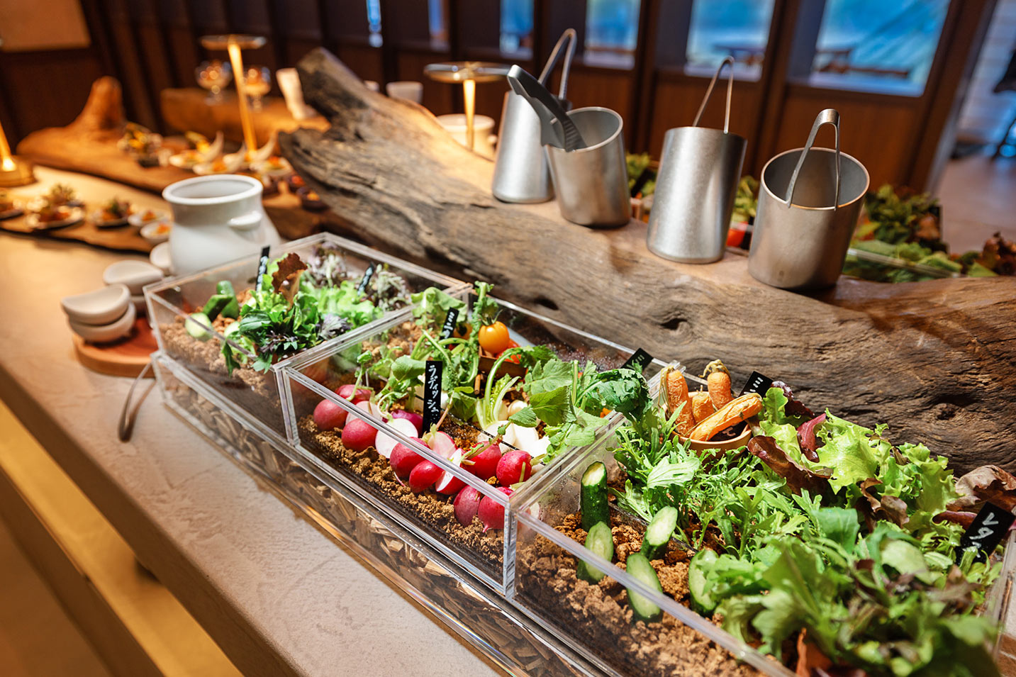 店内に備えられたテーブルは、夕食時に小さな農園となり、近隣野菜の収穫体験を、朝食ではスムージーやサラダが並びます。「心と身体をととのえる」食体験をお楽しみください。